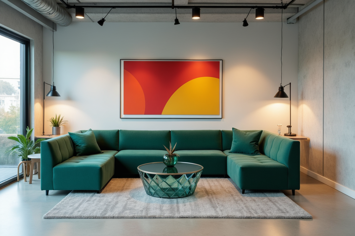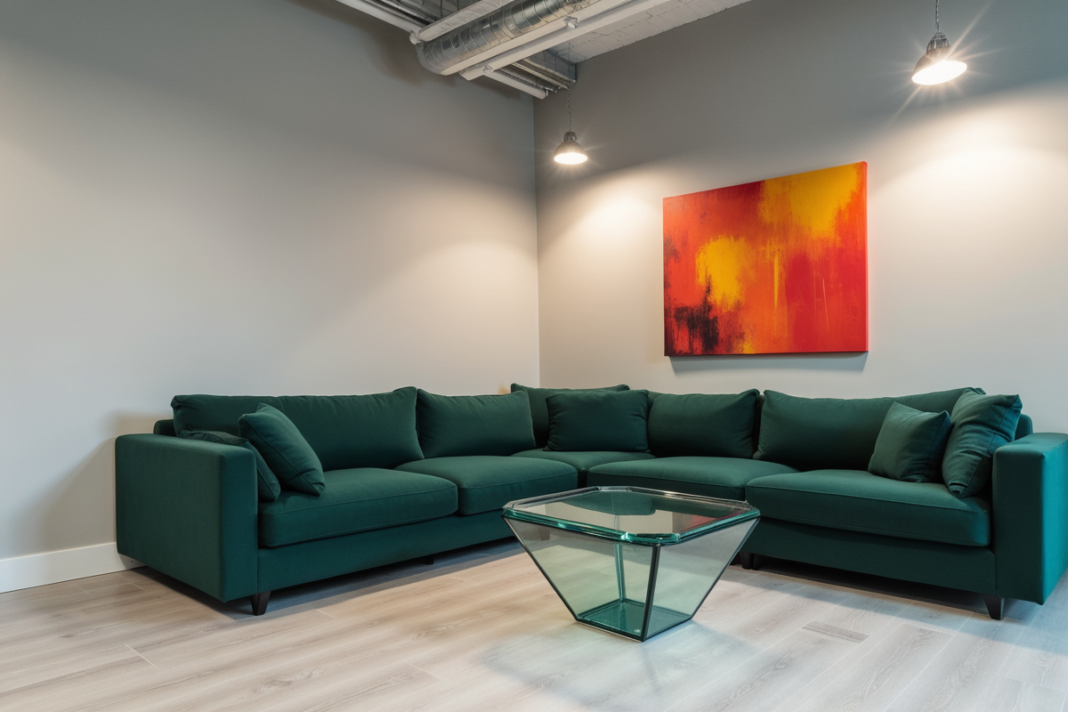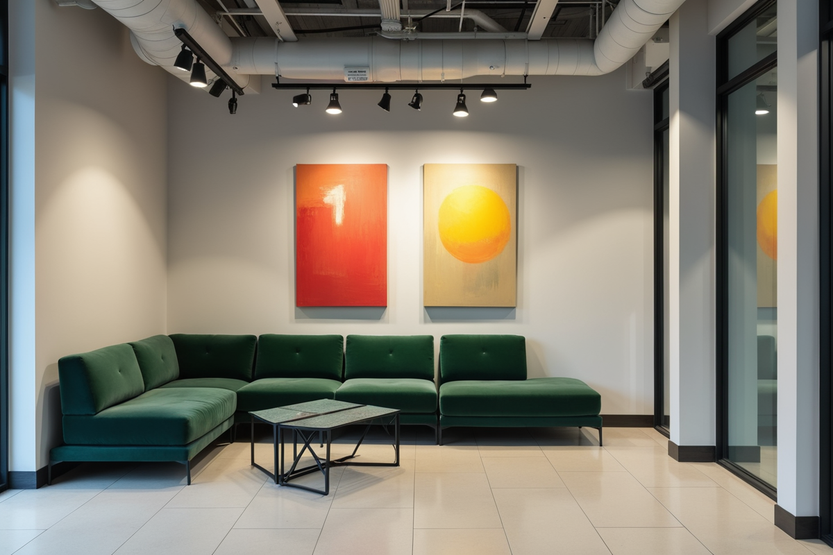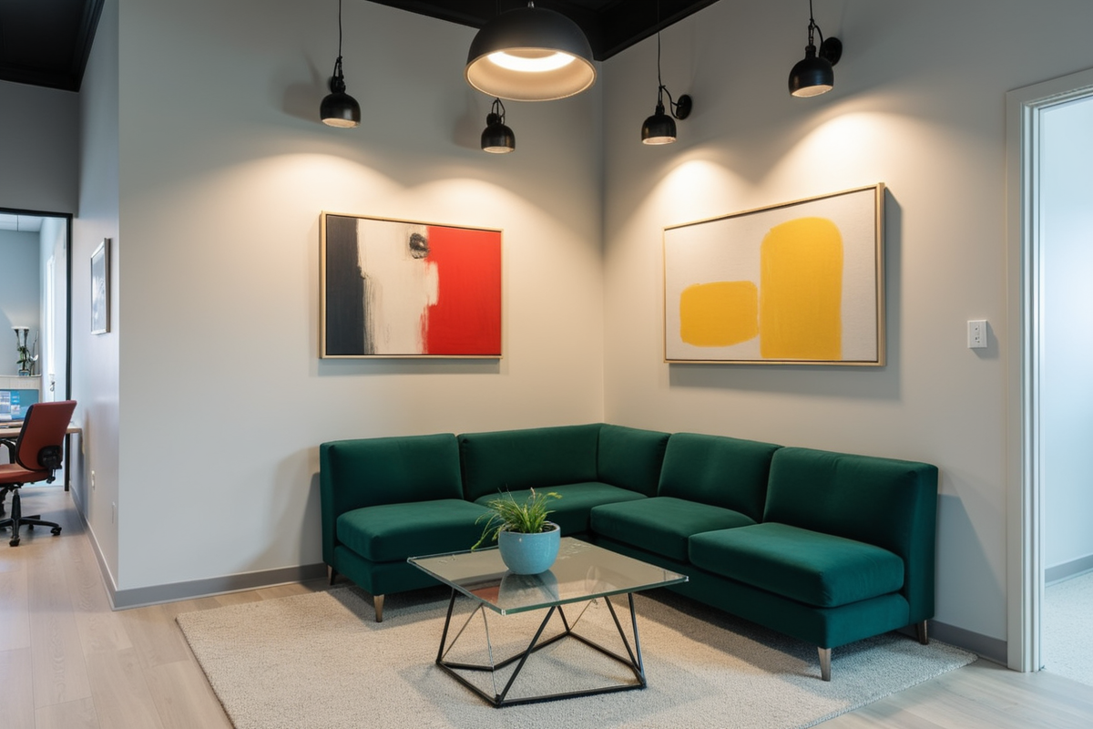 Abstract Art office interior gray walls common area trendy office green sofa geometric table