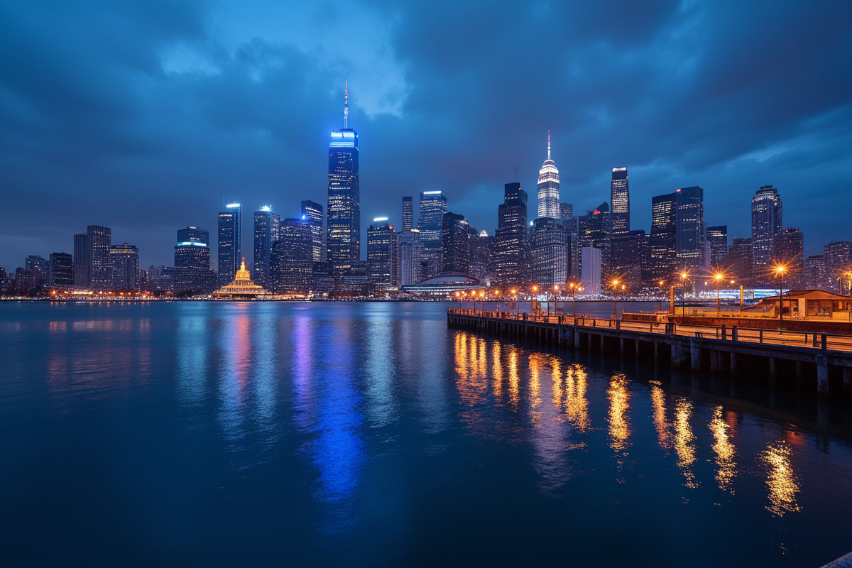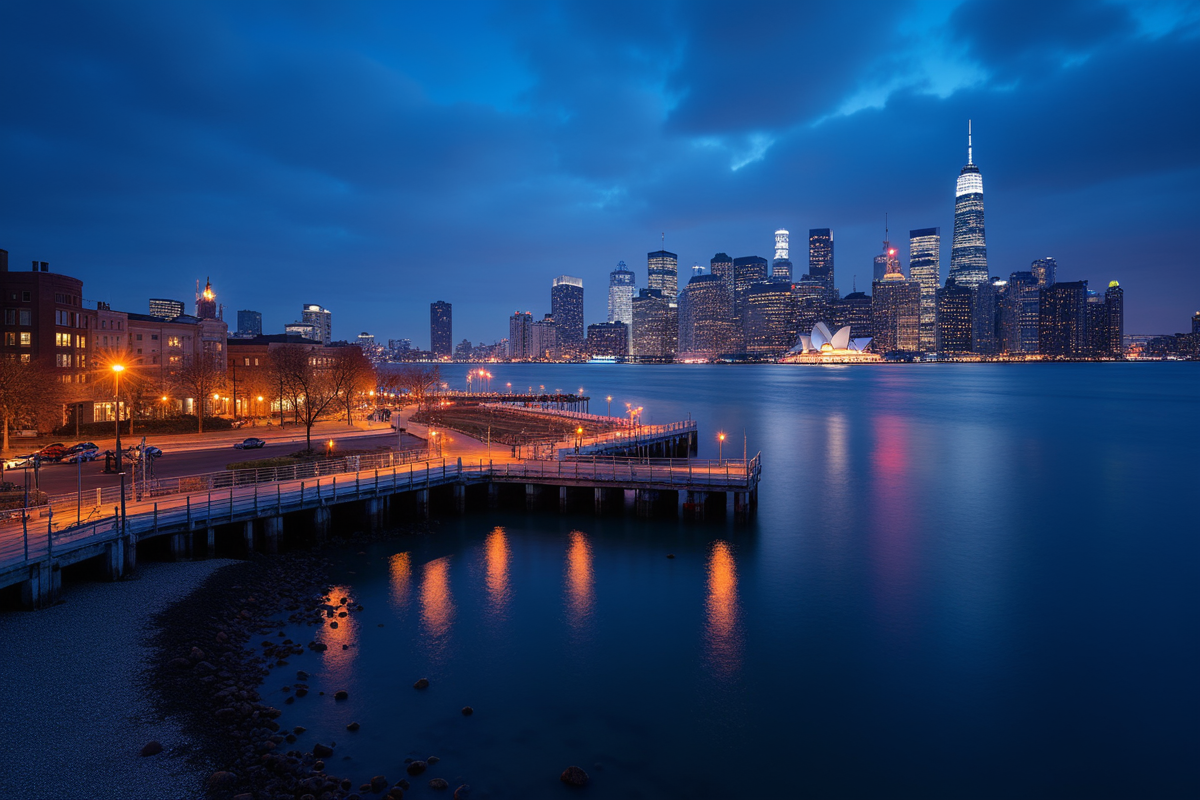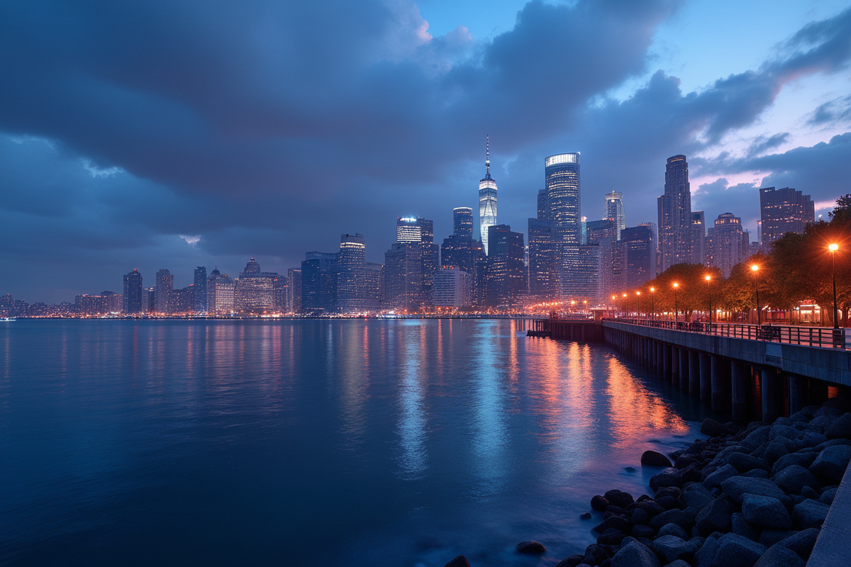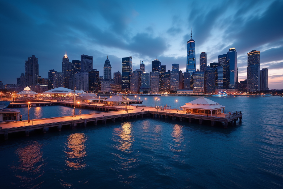dusk dynamic cityscape modern buildings city lights glowing lights waterfront piers lively scenes