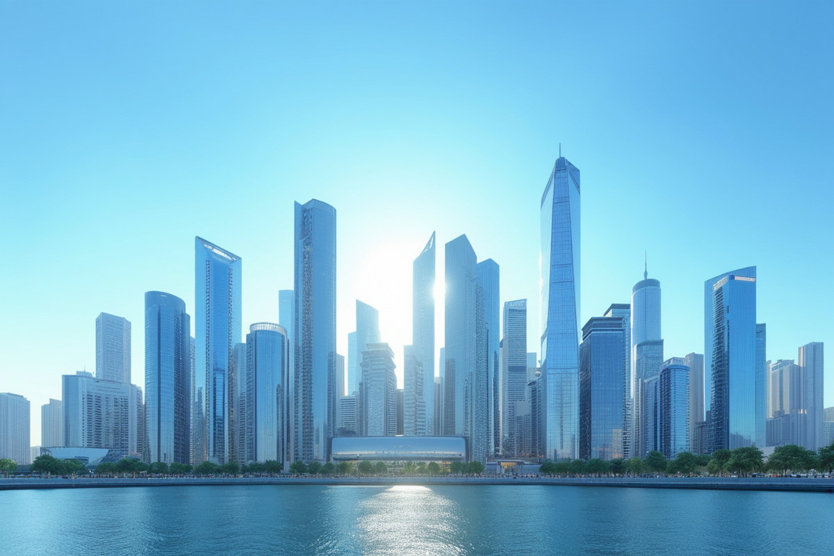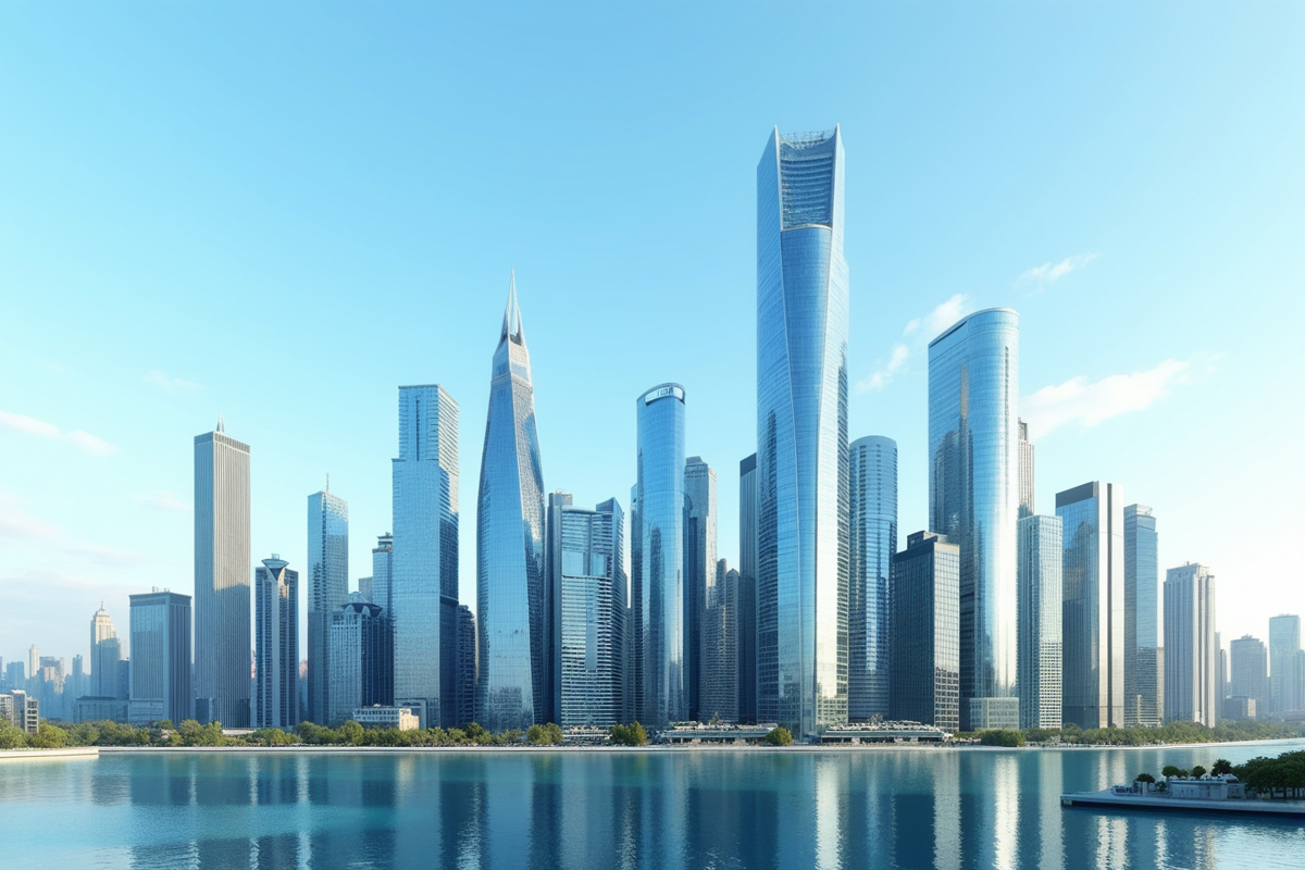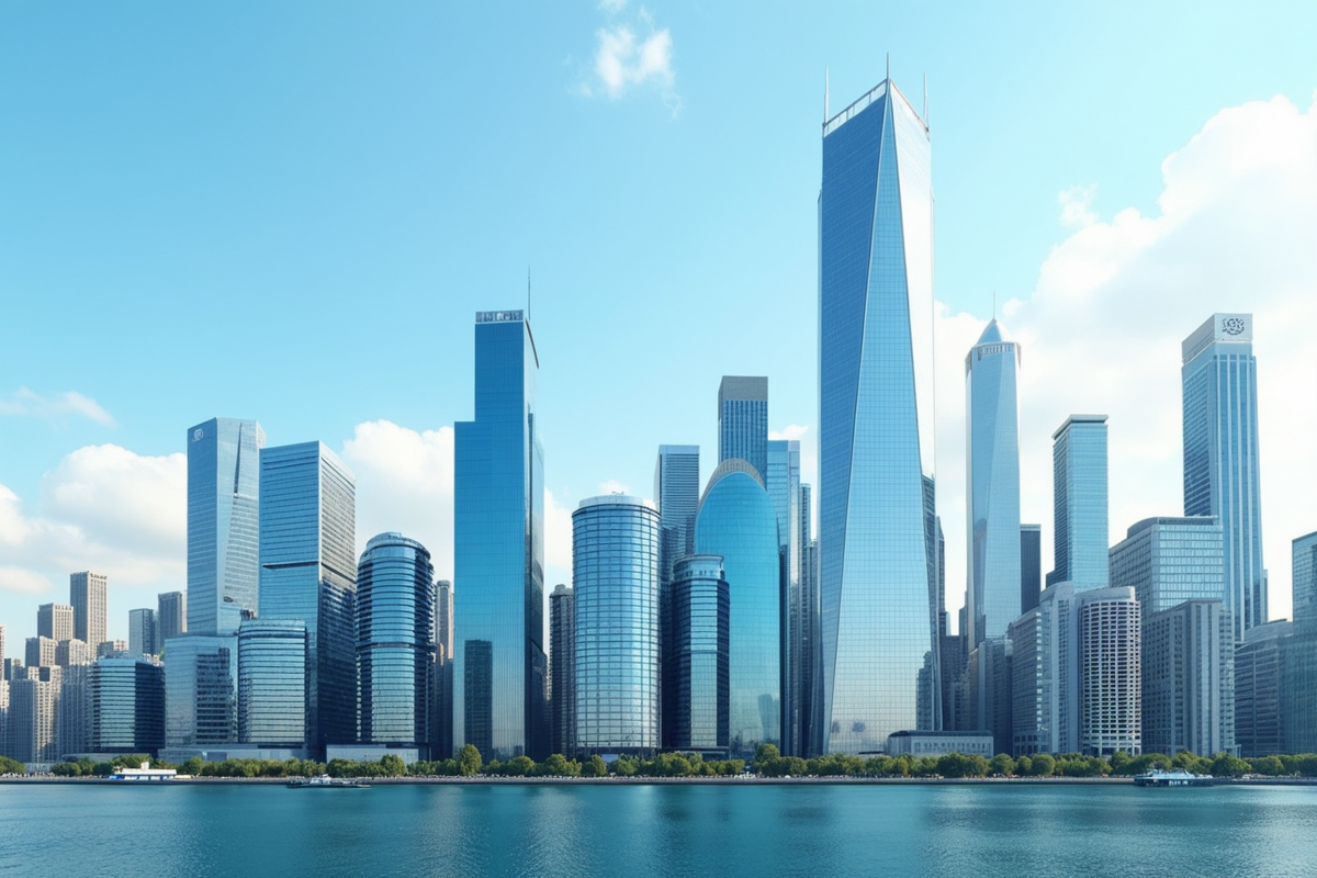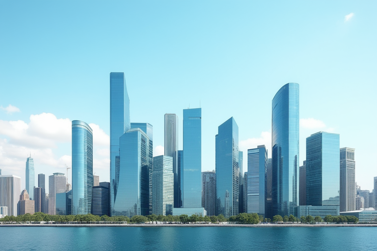 clear skies glass facades daytime modern skyline contemporary skyscrapers reflecting surfaces vibrant city life