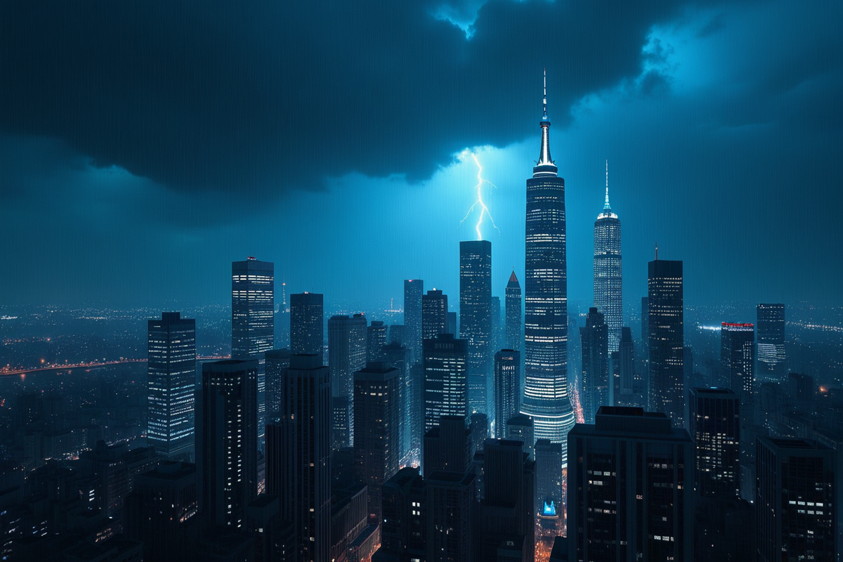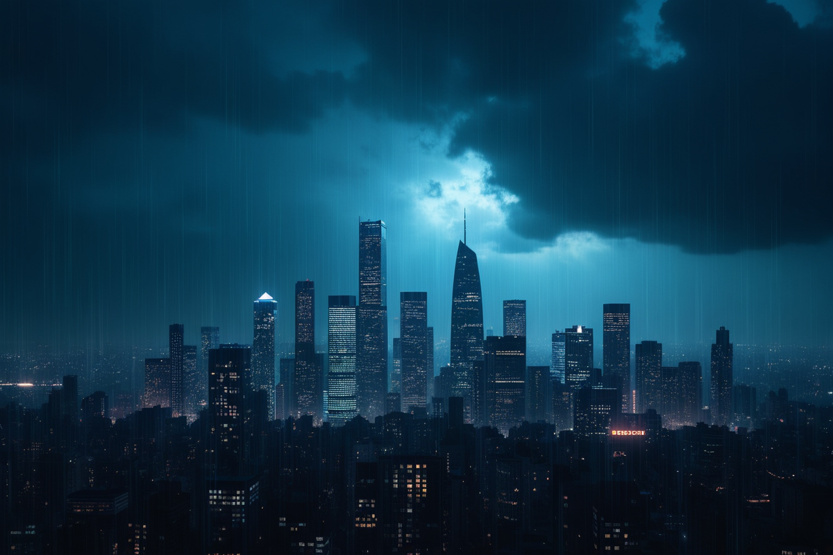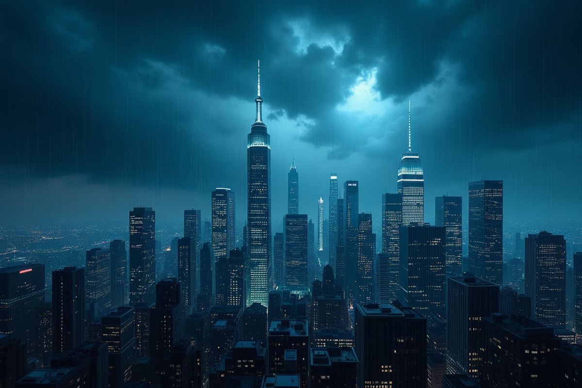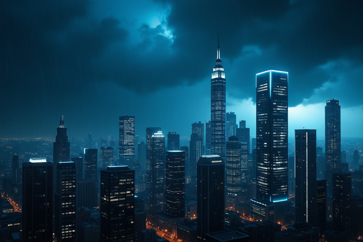 dark clouds glass facades Dramatic lighting dramatic skyline stormy night rain reflective surfaces