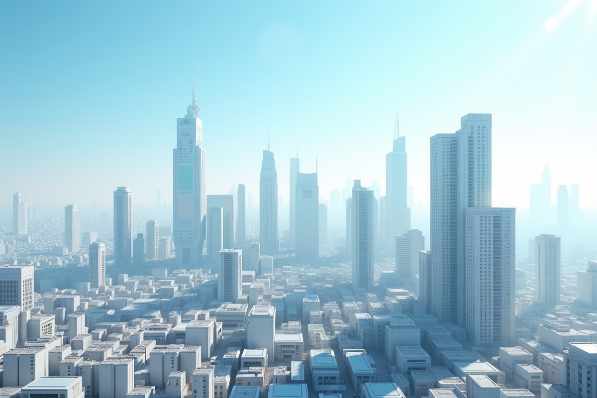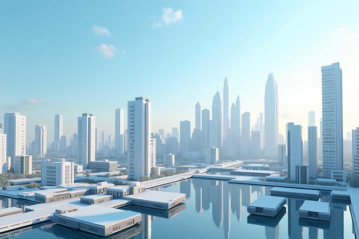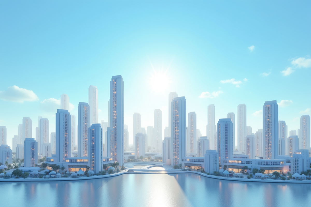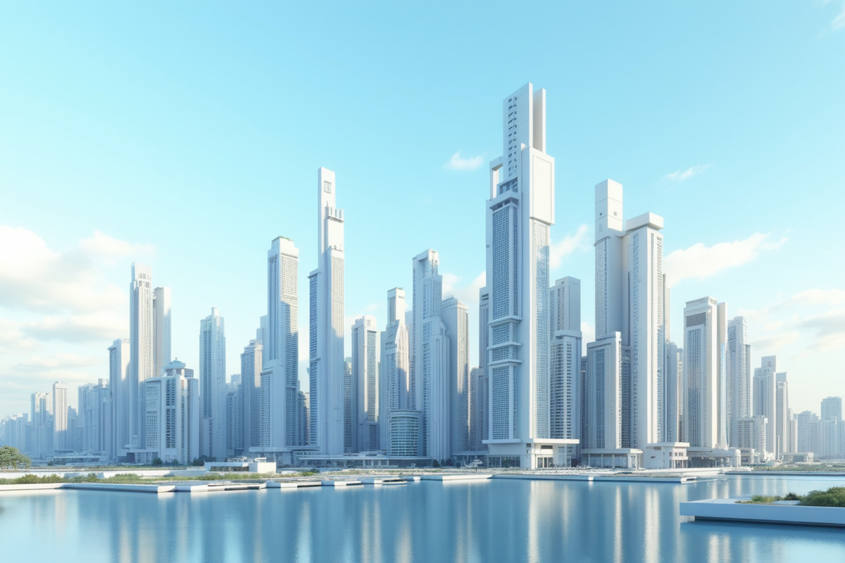 clear skies daytime futuristic skyline modern buildings modular architecture customizable units unique cityscape
