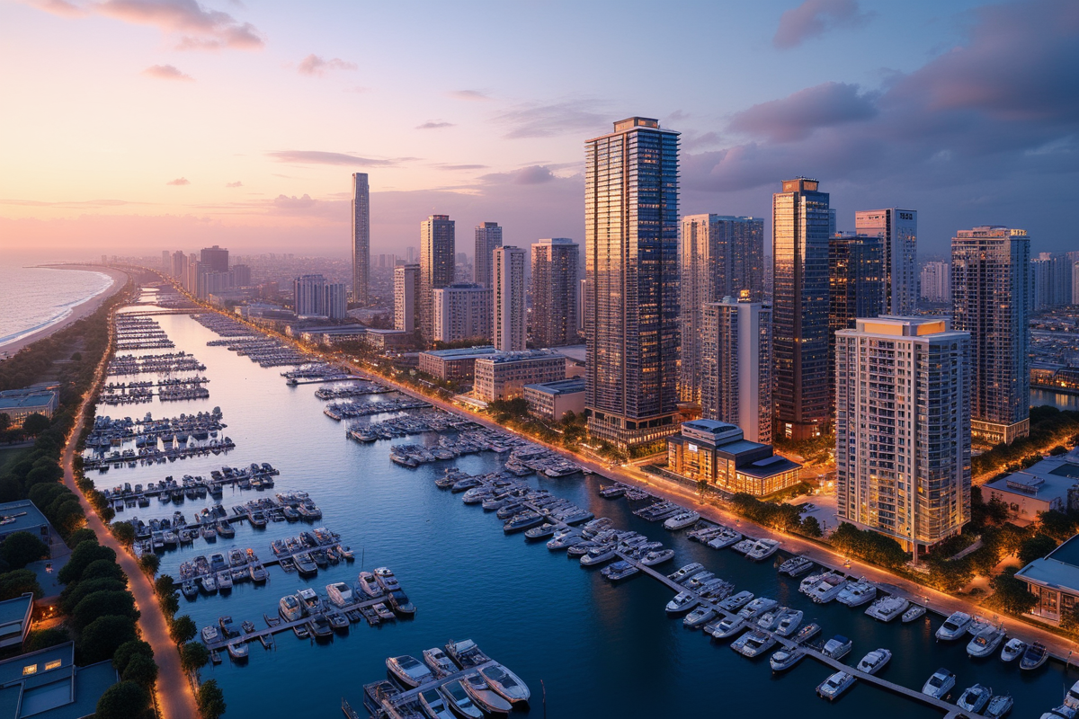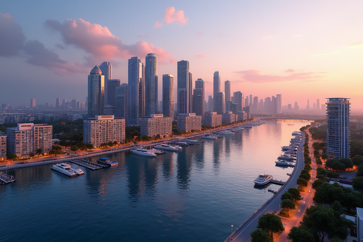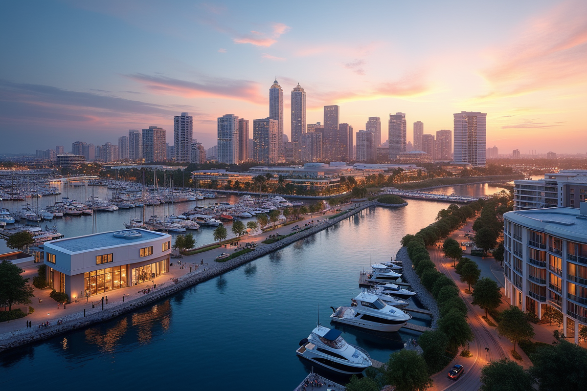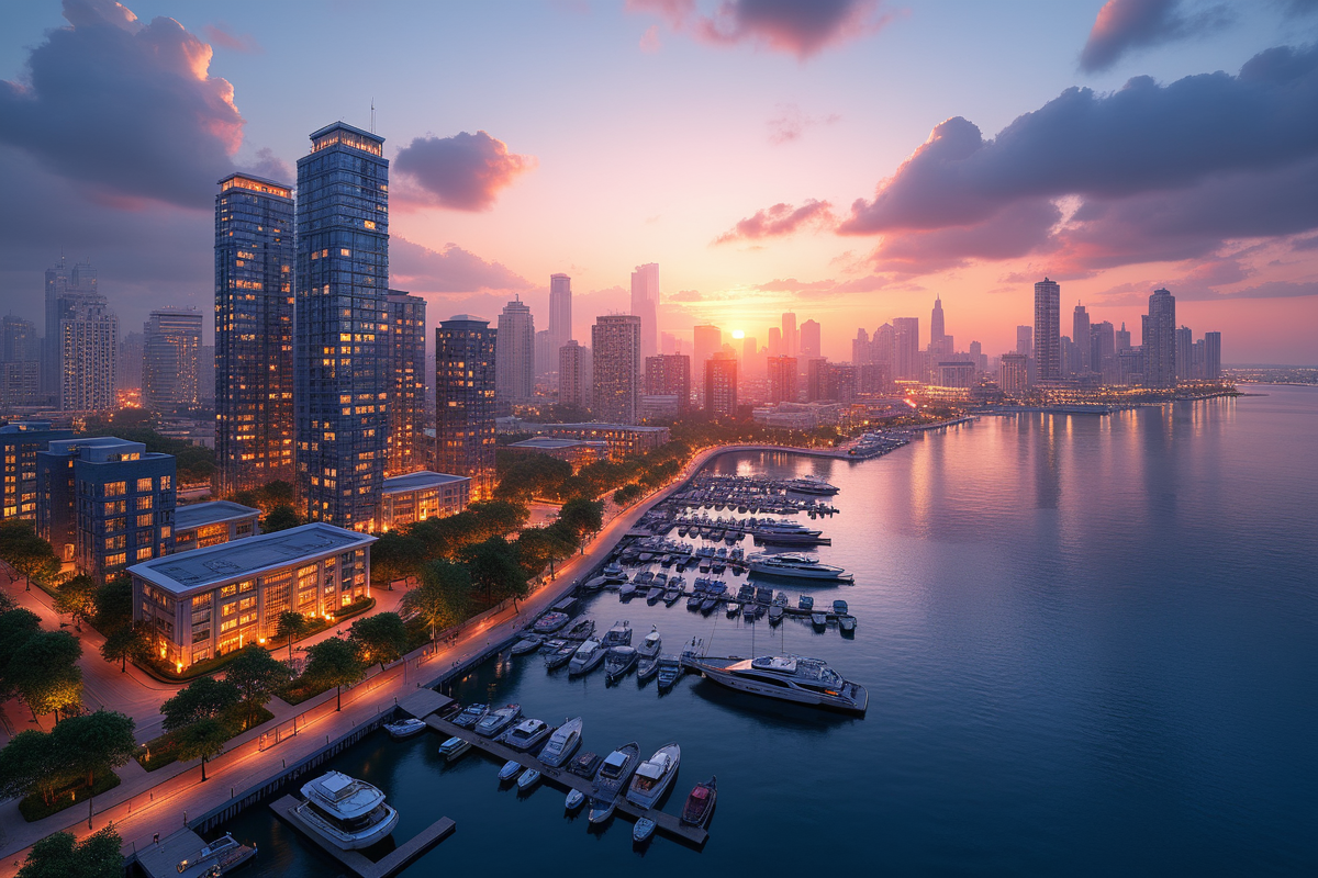 sunset impressive cityscape waterfront developments marina views modern apartments scenic boardwalks