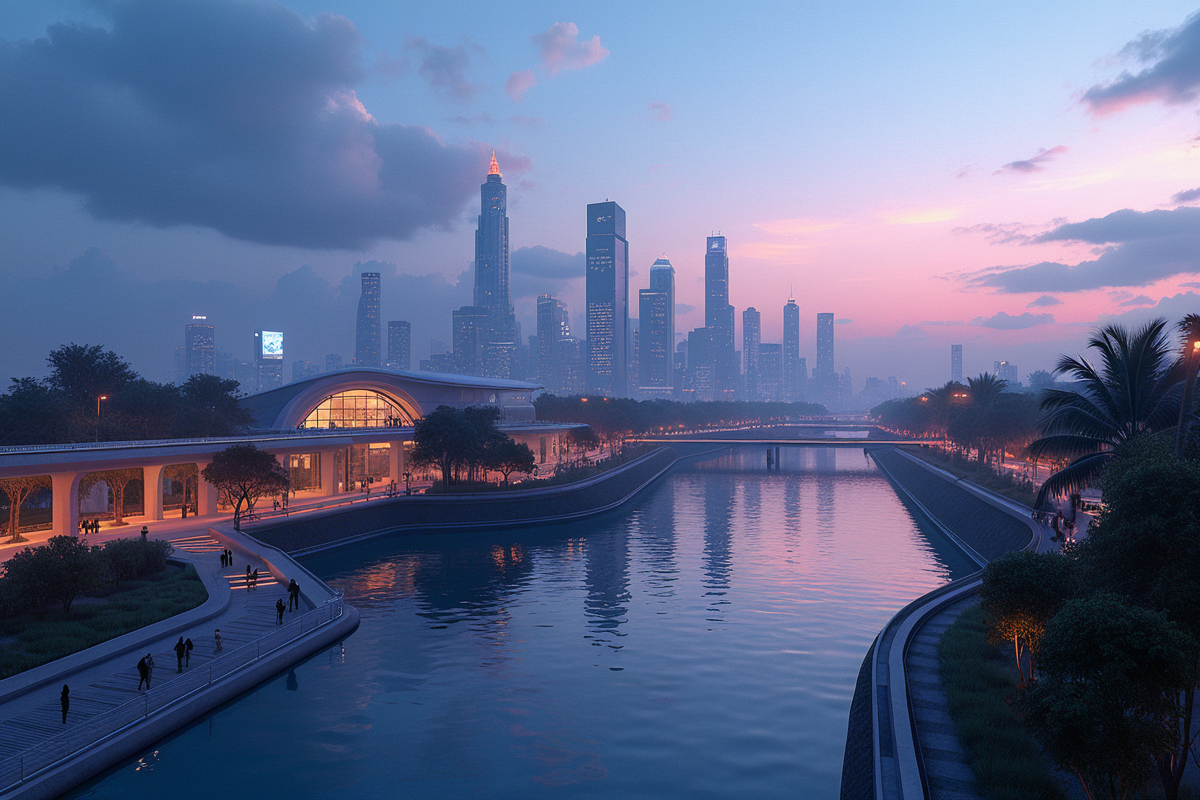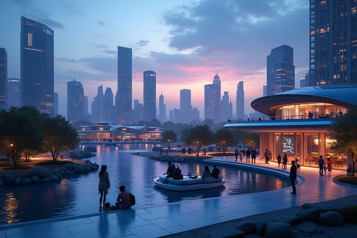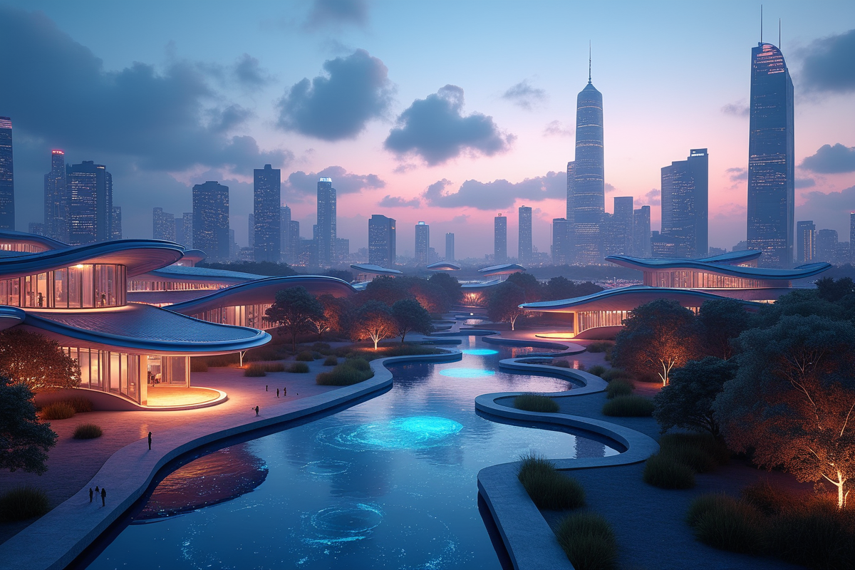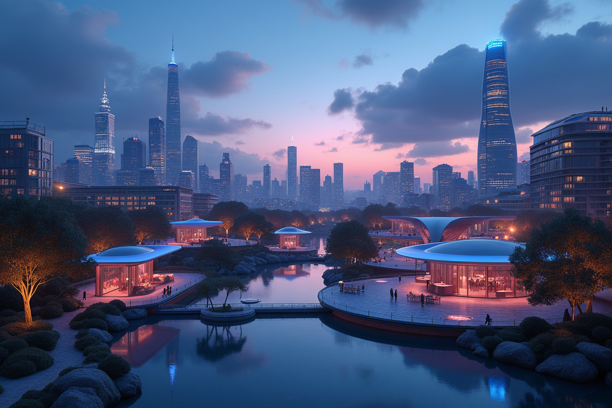twilight modern architecture ambient lights peaceful evening captivating skyline futuristic public spaces interactive technology