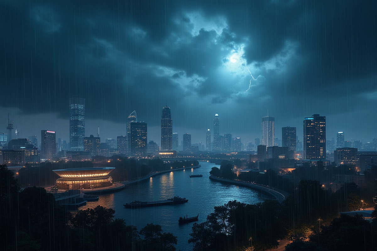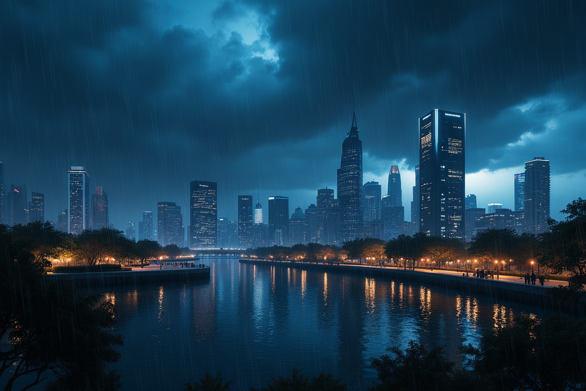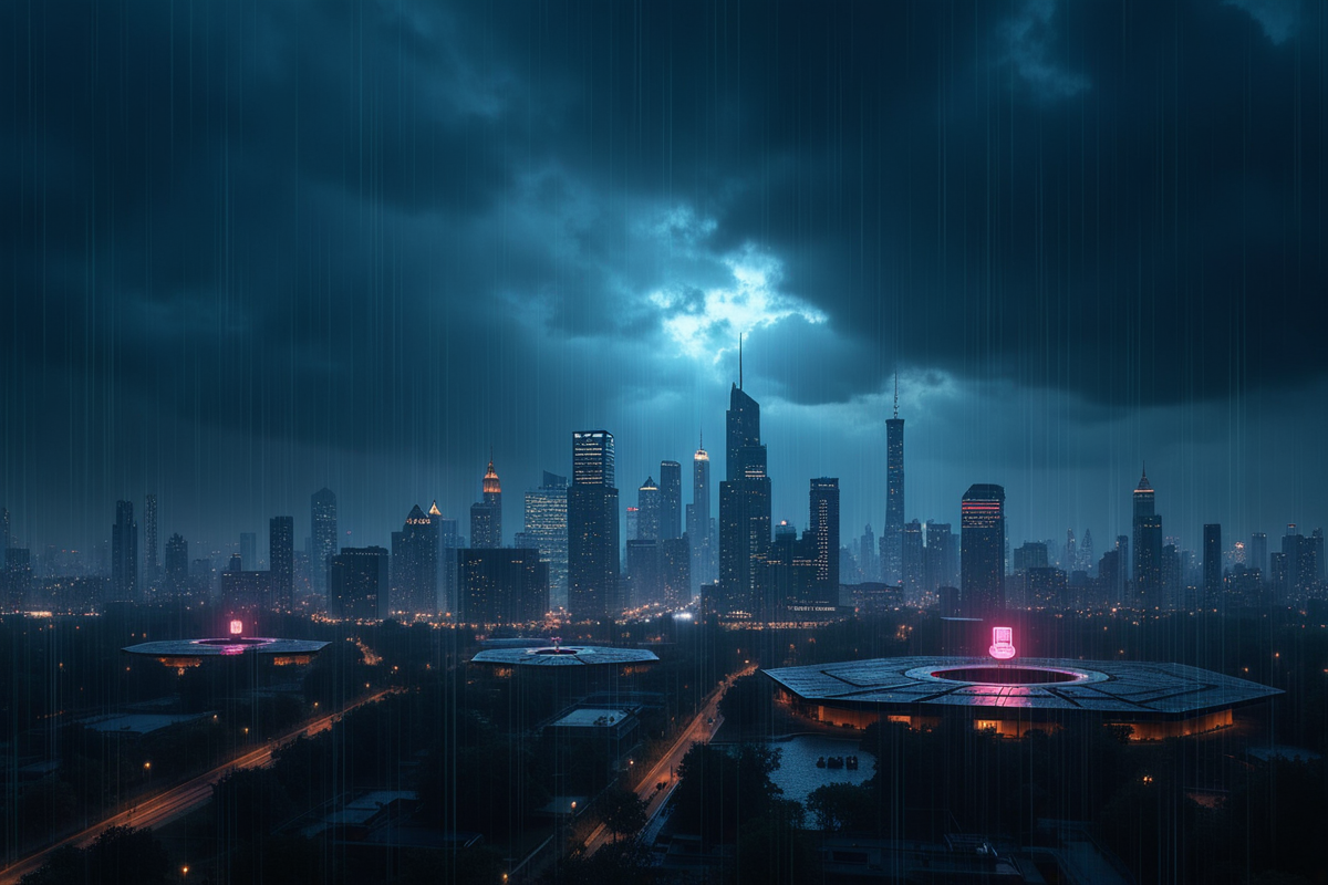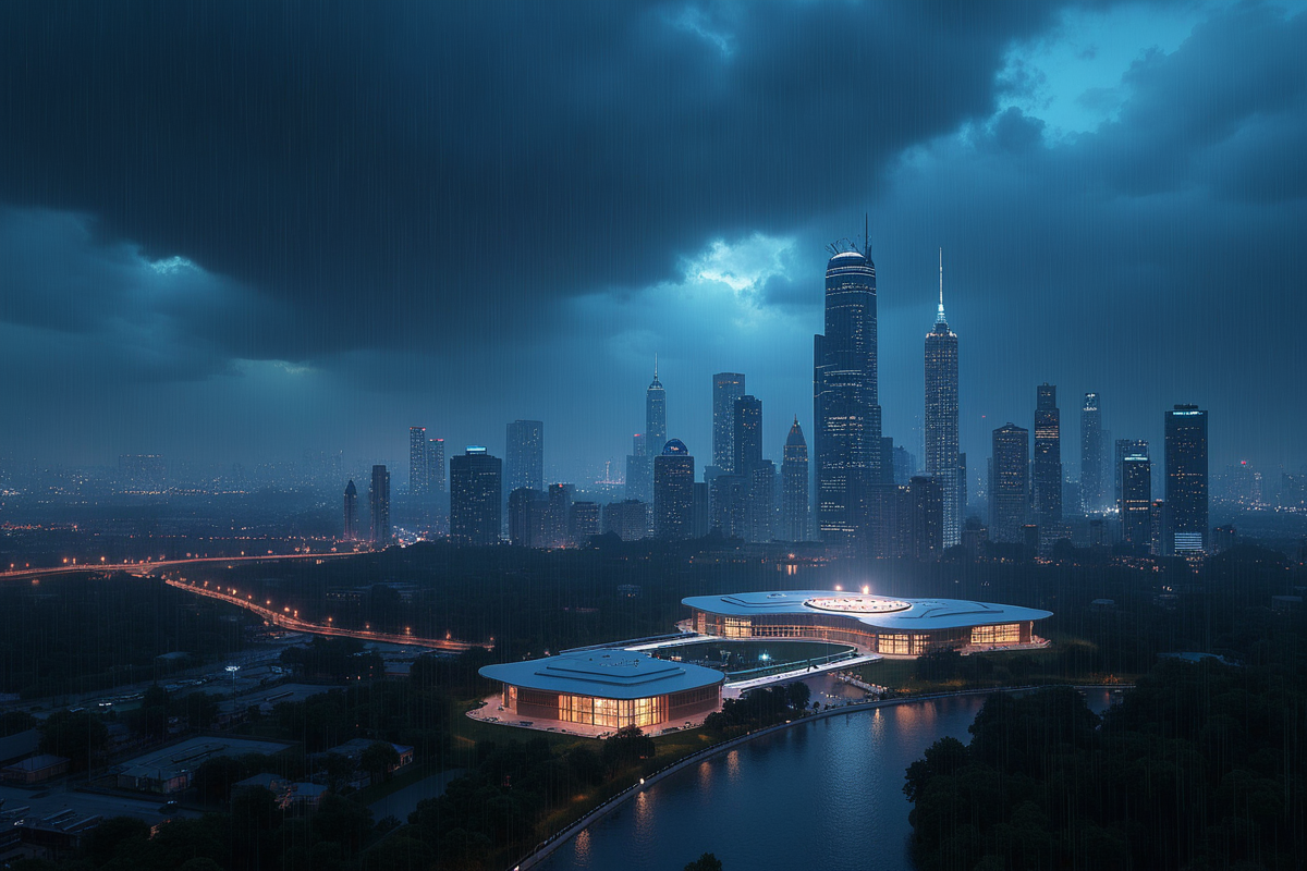 dark clouds Dramatic lighting high-tech designs dramatic skyline stormy night rain futuristic public spaces