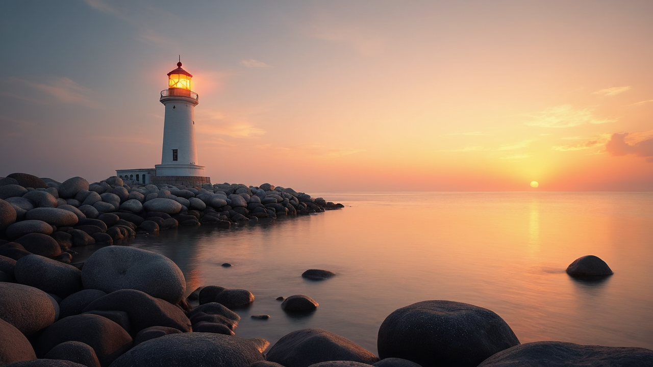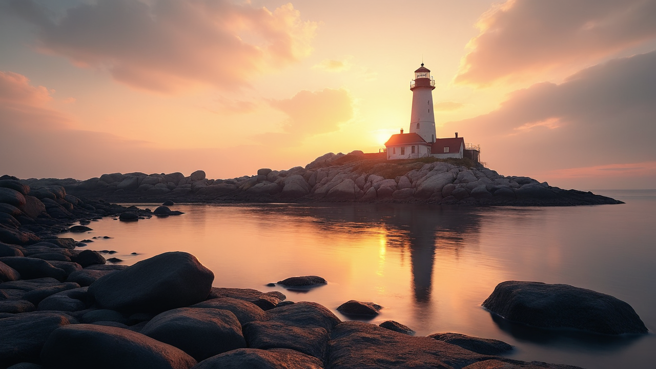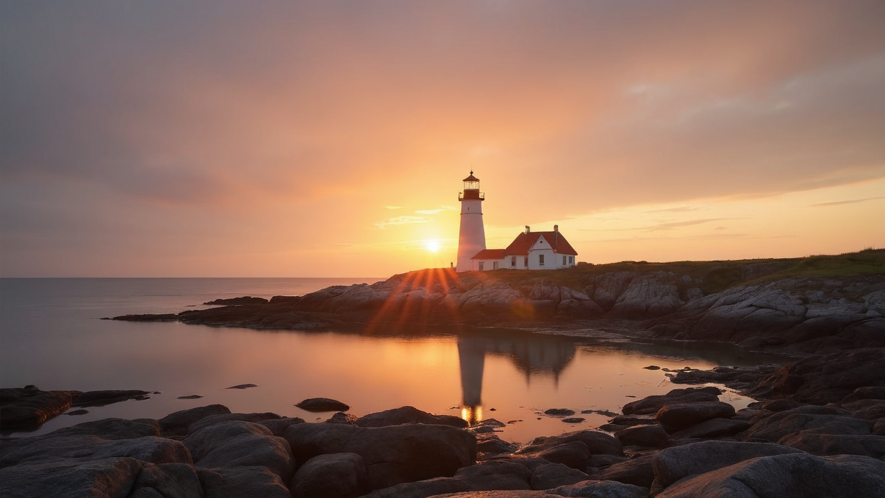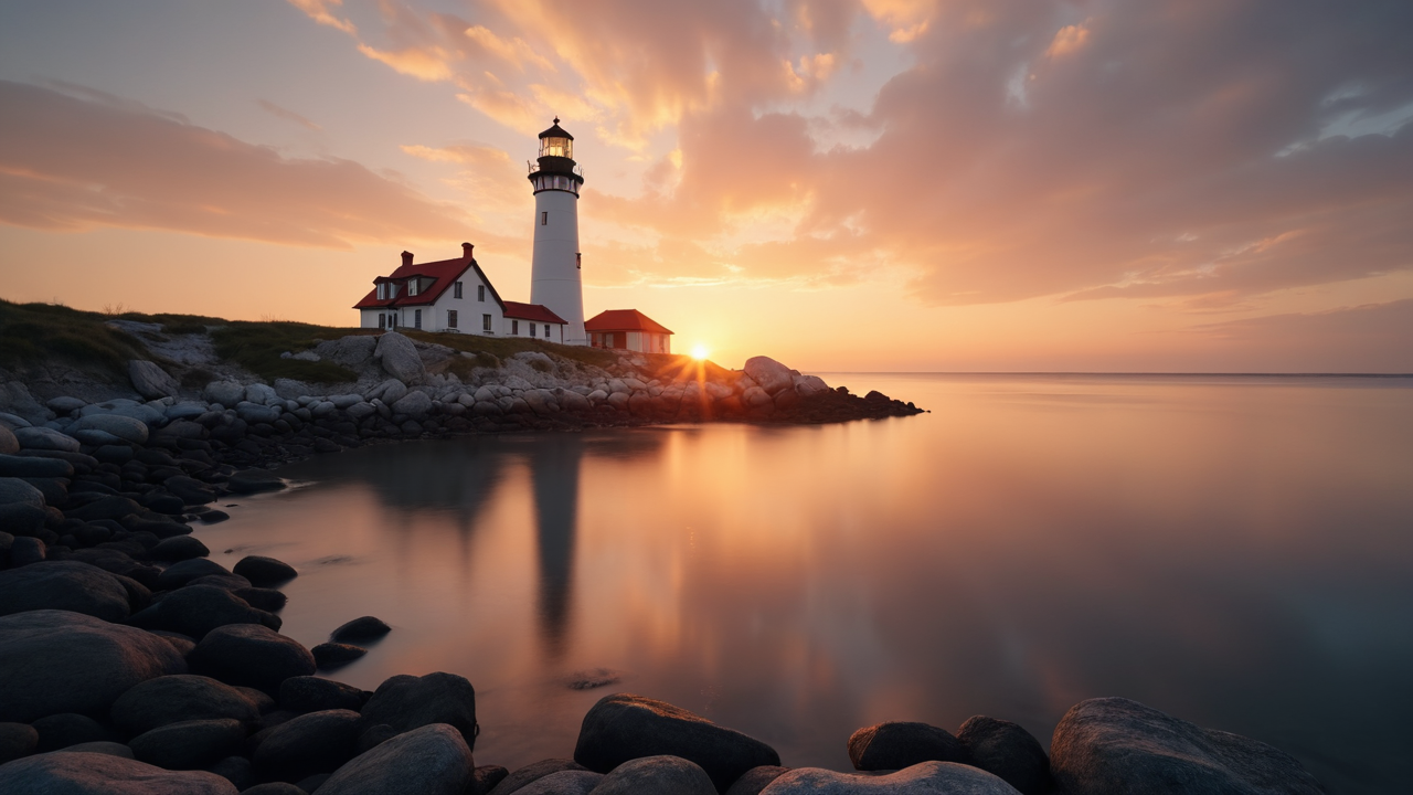 sunrise rocky shore golden light sunrises peaceful dawn calm reflection Sunrise lighthouse