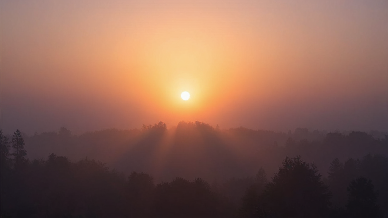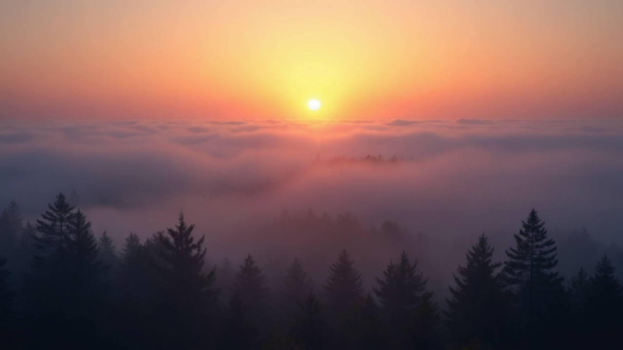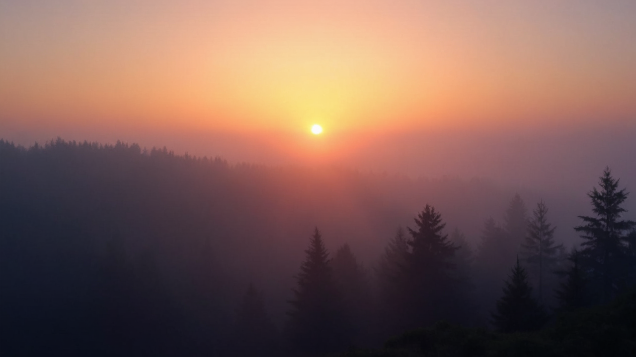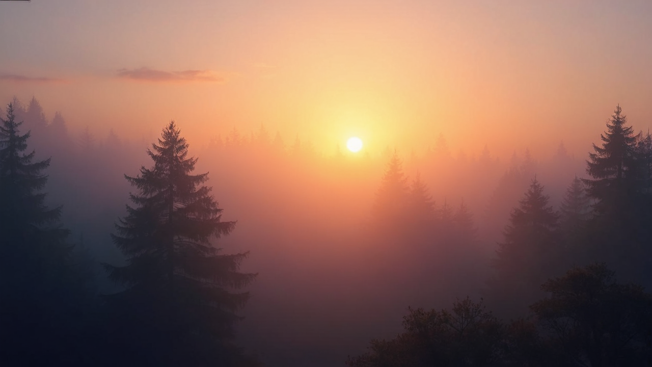 soft light sunset serene atmosphere foggy forest sunsets Ethereal Sunset Warm Gold to Purple