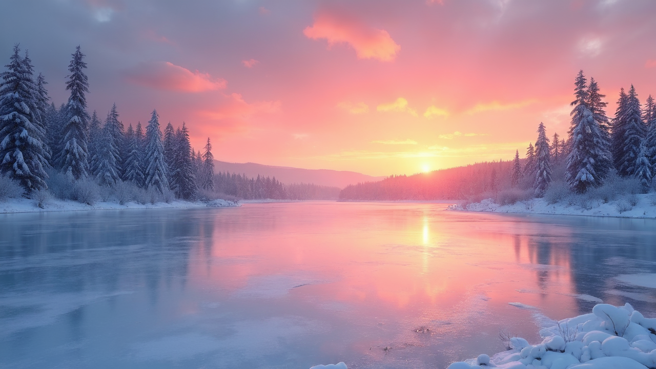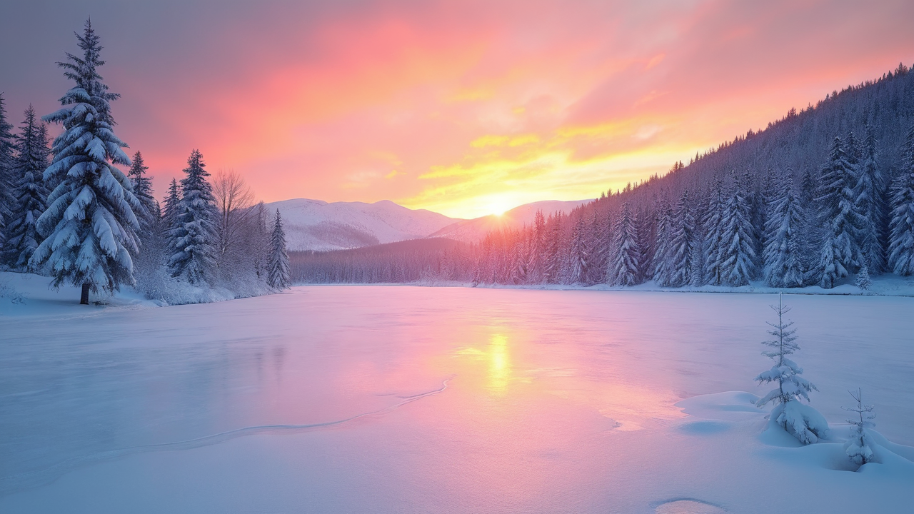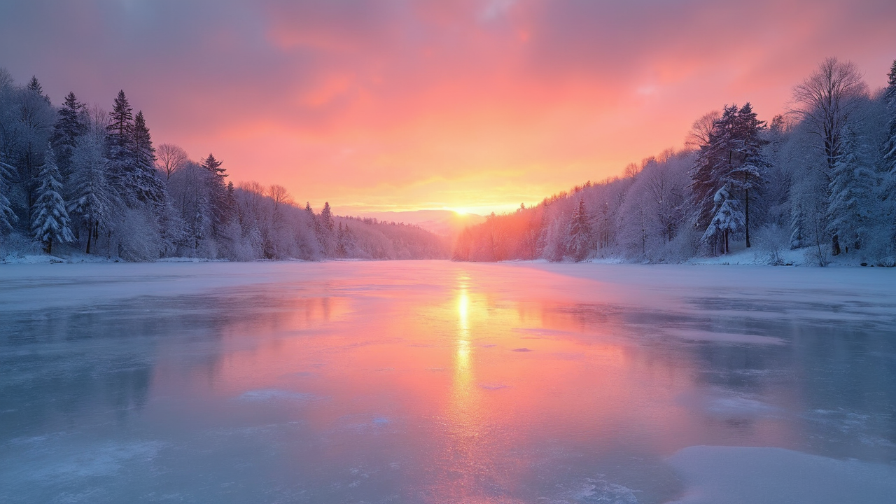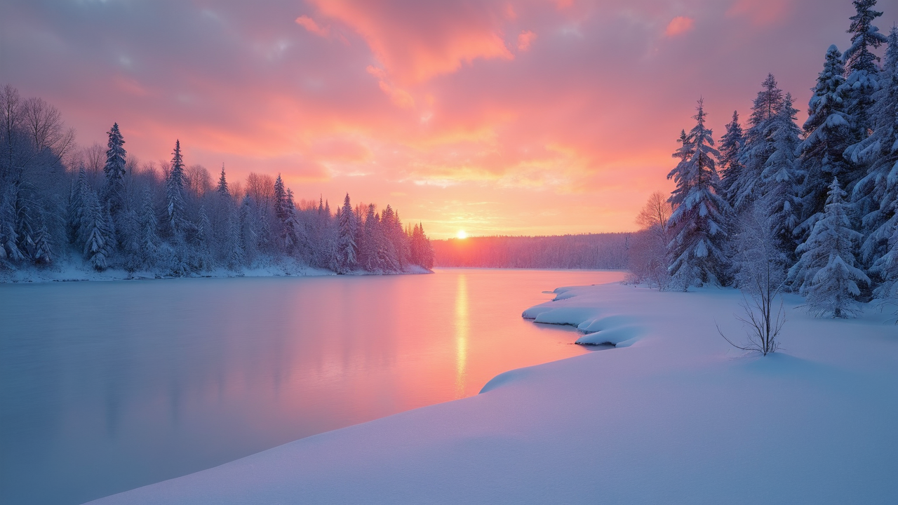 sunset vibrant sky warm glow frozen lake sunsets Snow-Covered Trees Peaceful Winter