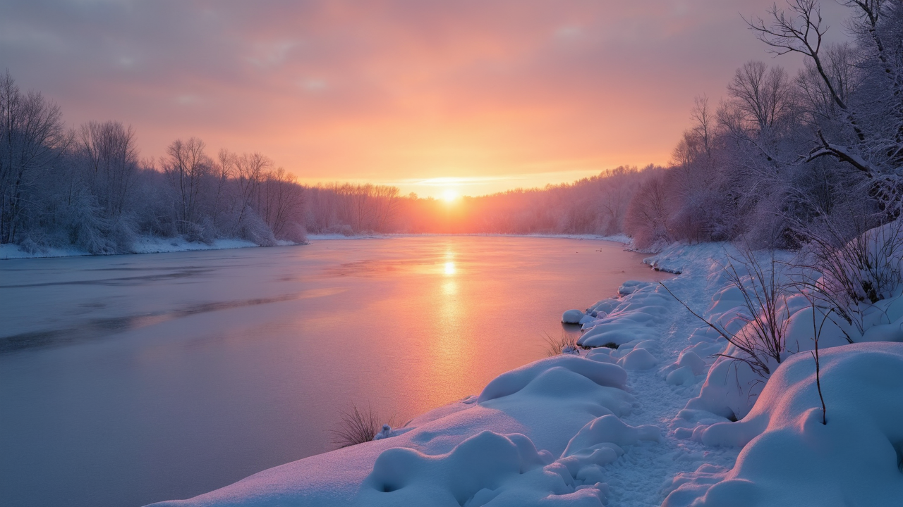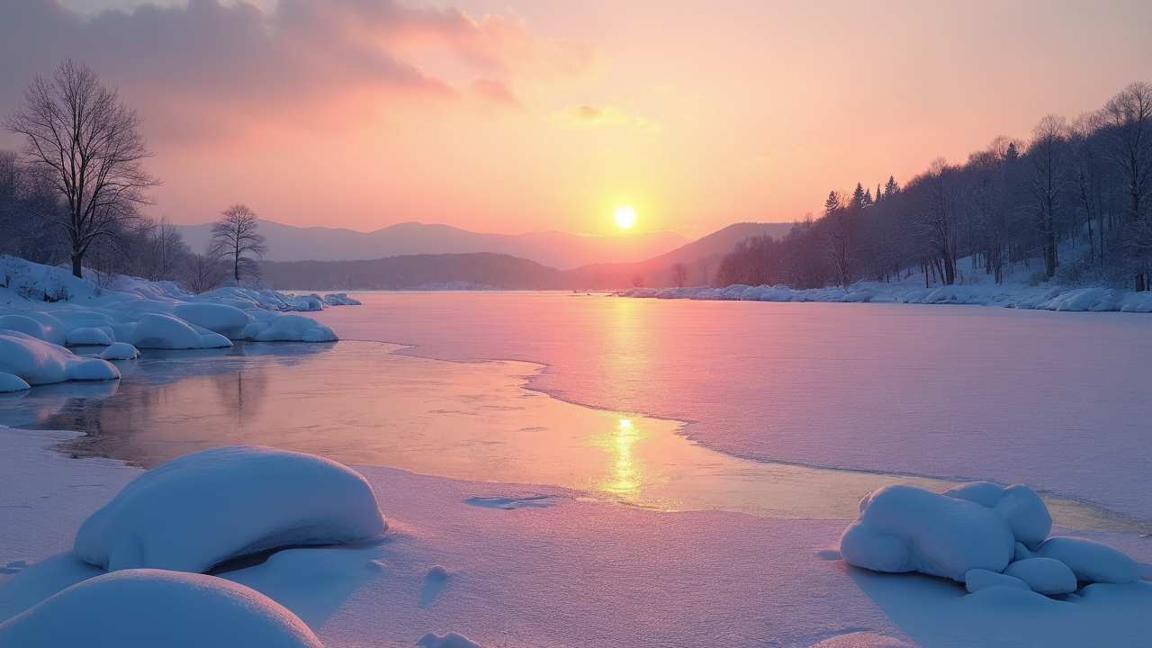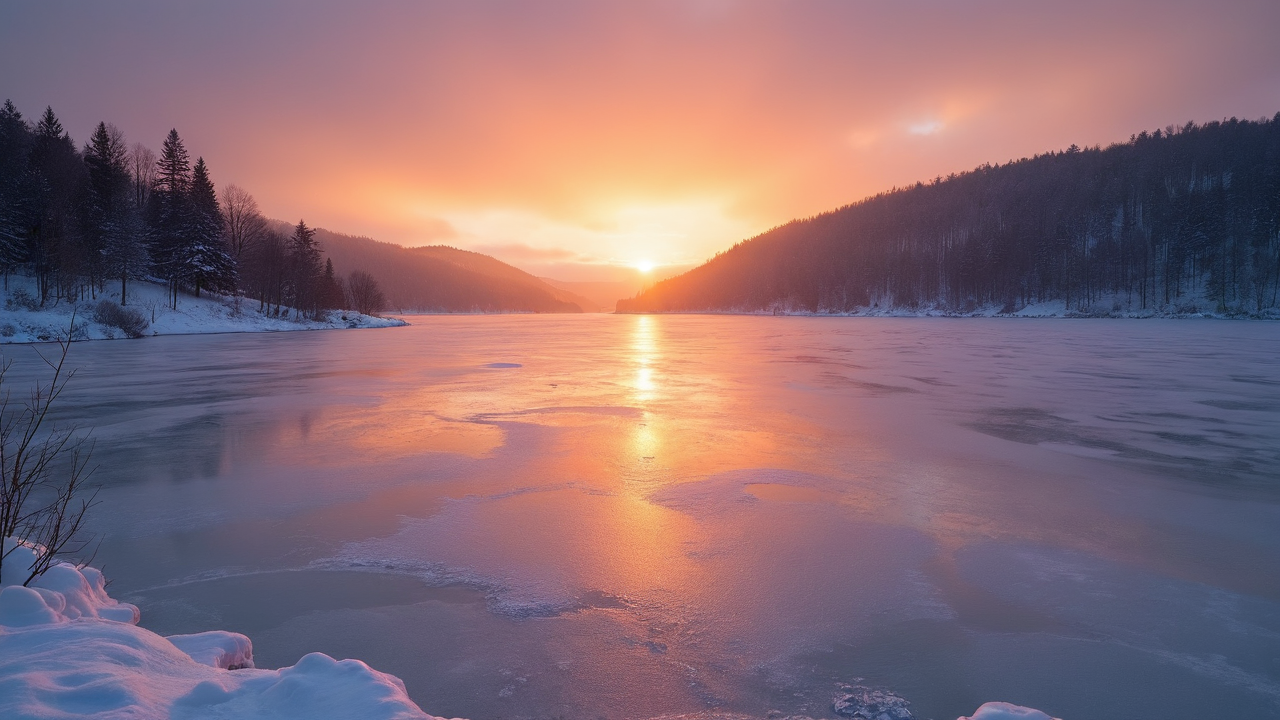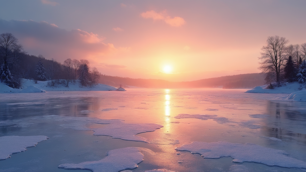 sunset warm hues frozen lake sunsets Snow-Covered Landscape Icy Surface